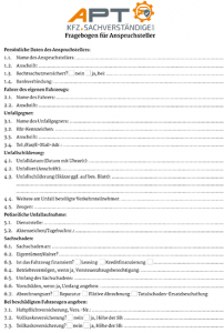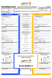 Oft geht es schneller, als man denkt: Sie sind in einen Unfall verwickelt. Jetzt heißt es, einen kühlen Kopf zu bewahren und die notwendigen und richtigen Schritte zu tun. Dieses Formular wird benötigt, um alle notwendigen Daten zu erfassen und keine wesentlichen Informationen zu vergessen.